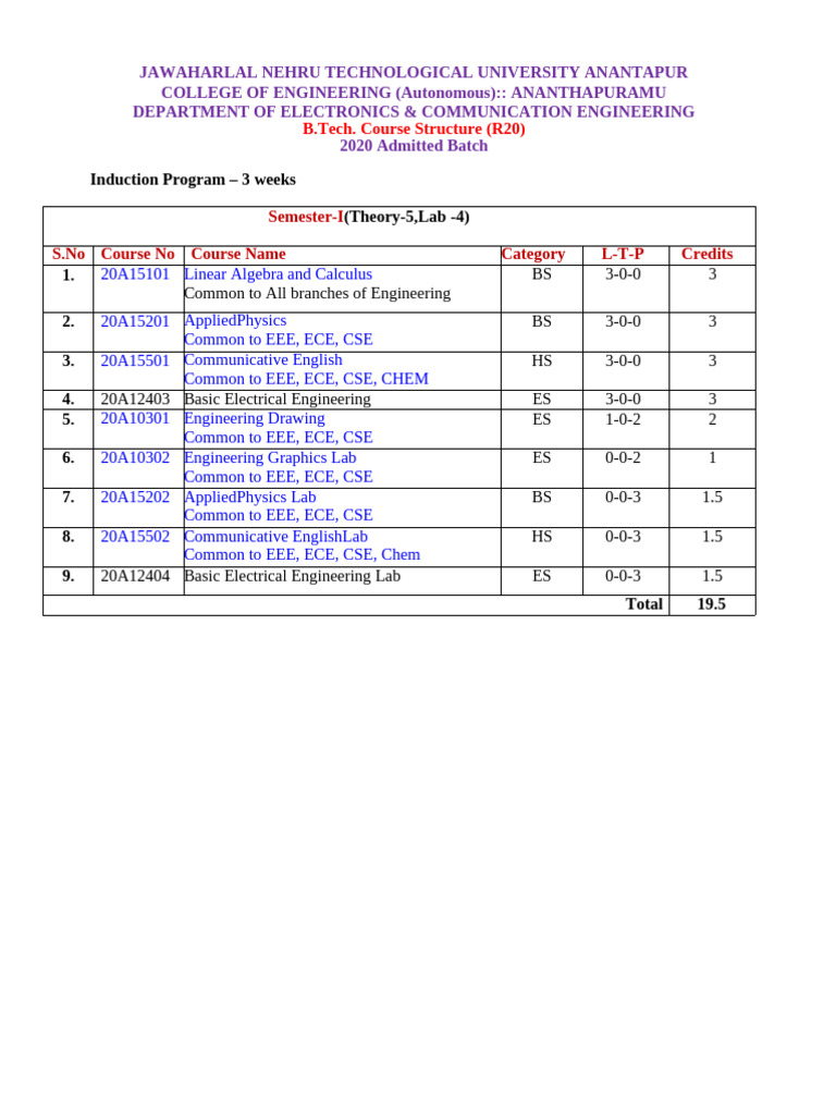 B Tech Electronics & Comunnications Engineering R20 Syllabus