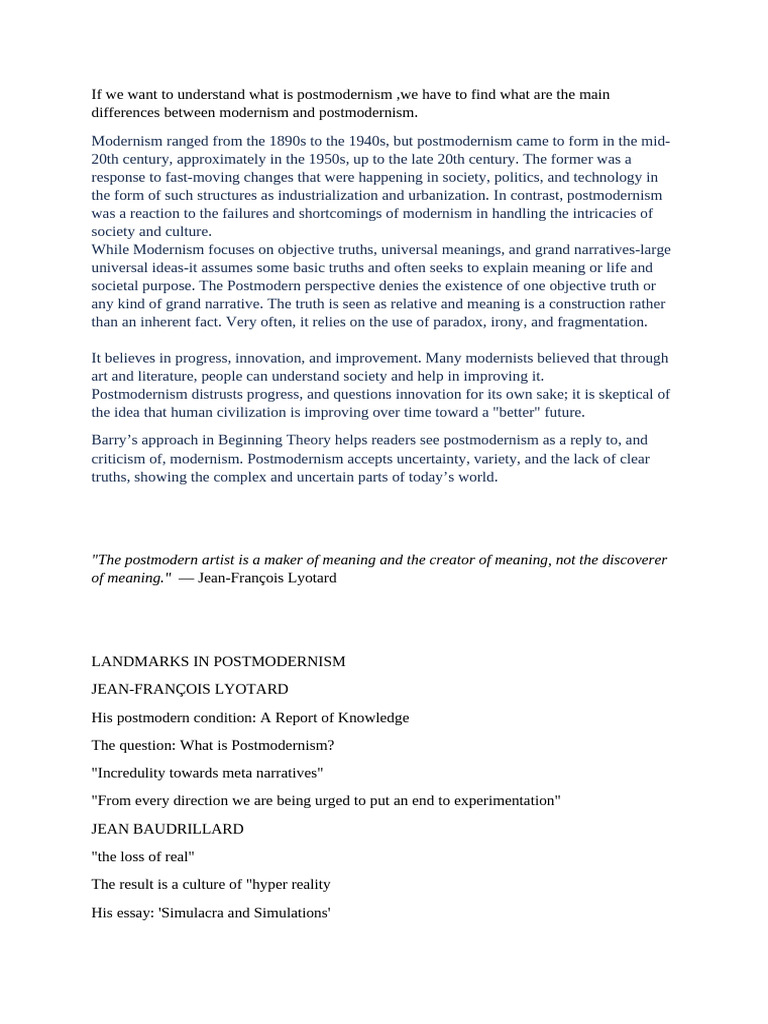 Barry’s approach in Beginning Theory helps readers see postmodernism as a reply to, and