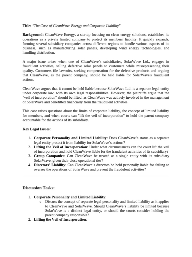 Title: "The Case of CleanWave Energy and Corporate Liability"