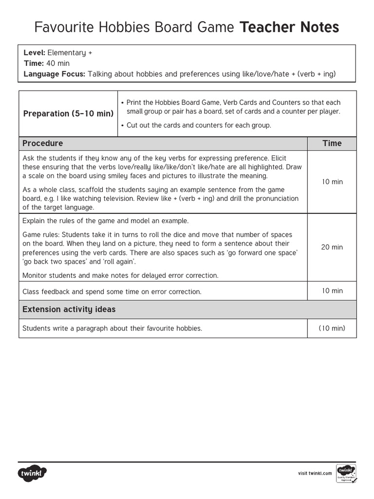 • Print the Hobbies Board Game, Verb Cards and Counters so that each