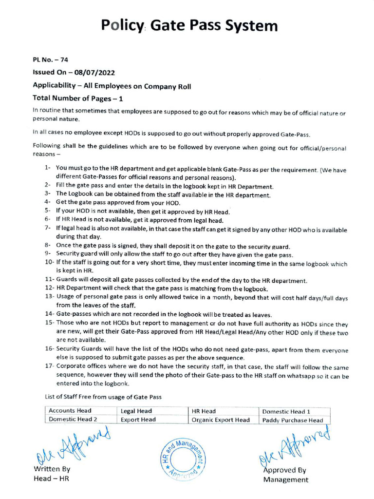 are new, will get their Gate-Pass approved from HR Head/Legal Head/Any other HOD only if these two