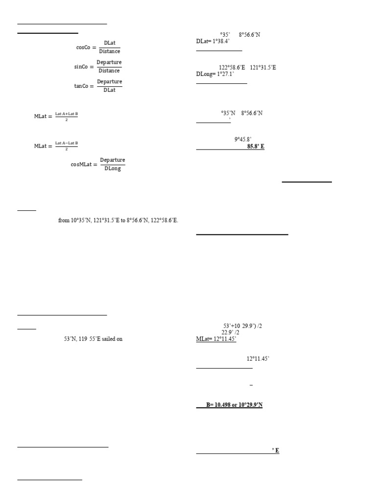 1. A vessel sailed from 10°35’N, 121°31.5’E to 8°56.6’N, 122°58.6’E. Distance= Departure/sinCo