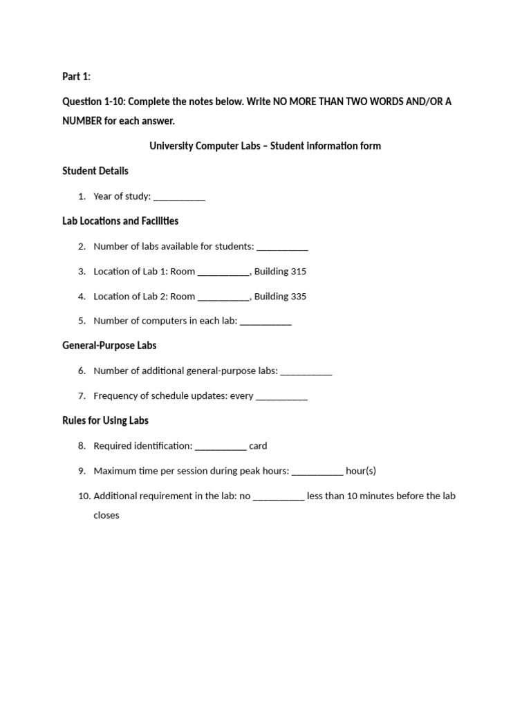University Computer Labs – Student information form
