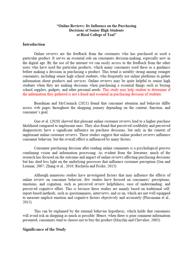 ● To determine how Online Reviews influence the Purchasing Decision of Senior High