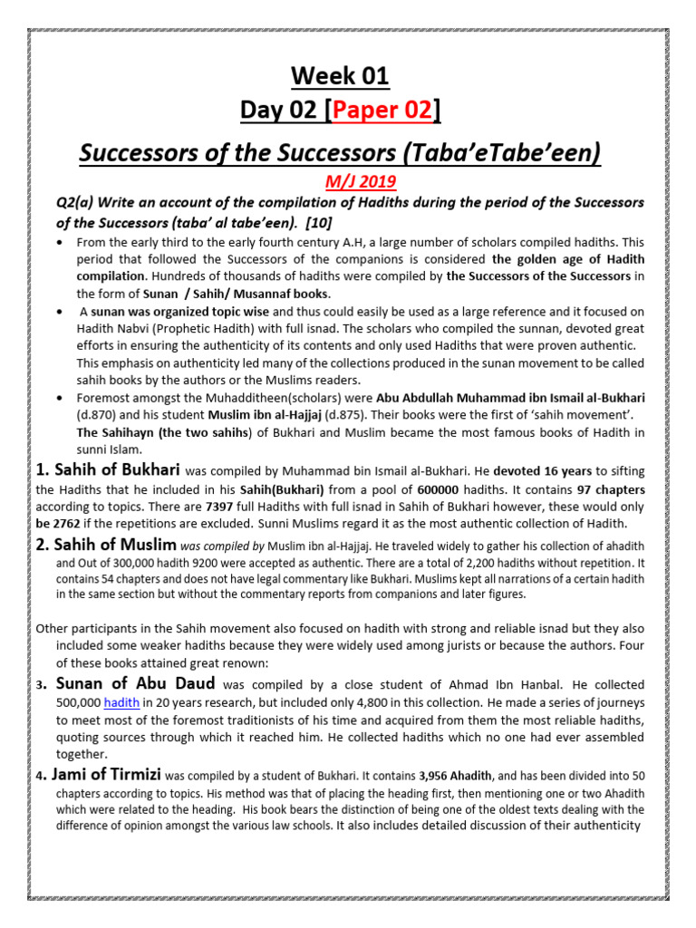 Q2(a) Write an account of the compilation of Hadiths during the period of the Successors
