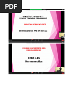 4. QUALIFICATIONS FOR INTERPRETING THE BIBLE: Regeneration: - To interpret scripture one must be born again; no one can fully comprehend the meaning of the Bible unless he has been regenerated. 1Cor. 2:14; 2Cor. 4:4 and Eph. 2:2, point out the facts that the unsaved person cannot discern and comprehend spiritual things because he/she has not got the spiritual capacity to handle spiritual things; he/she is spiritually blind and dead. They do not have the indwelling Holy Spirit. Reverence for and interest in God and His Word: - Anyone who wants to interpret the Bible must have reverence for a deep respect for God, believing that He exists and that the Bible is His Word or contains His Word. A prayerful and humble attitude: - He who seeks to interpret the Word of God must recognize that it is only the writer who has the original meaning to what he has writer or said and so the need to talk to Him. He also need to recognize that in spite of talking to the author of the passage for understanding the possibility still exist for misinterpreting or misunderstanding the biblical text because we are fallible human beings. A willingness to obey the Word of God: - The approach should be one of a willingness to obey whatever will be learnt from the scriptures. Dependence on The Holy Spirit: - The Holy Spirit is both the author and the supreme and true expositor of the Word of God. This means that: i. He does not guarantee infallibility in the interpretation of scripture; the interpreter is human and for that matter fallible ii. He gives all interpreters the same meaning in conformity with the normal, literal meaning of the passage, not a secret or hidden meaning to one interpreter and a different one to another. iii. An interpreter who is wallowing in sin cannot make an accurate interpretation of the scriptures because his heart and mind are not in harmony with the Holy Spirit. iv. He only leads and guides the interpreter into all truth but does not impose the truth on the interpreter v. He does not normally give sudden intuitive flashes of insight into the meaning of scripture; some passages are readily understood, others take time to be understood even after a careful study. vi. The Holy Spirit makes the understanding of the Bible available to everyone not only to a few Pastors or elite scholars. A willingness to study and know the background, history and theology of the Bible. An approach of sound judgement, reason, objectivity, not prejudice and preconceived notions.
