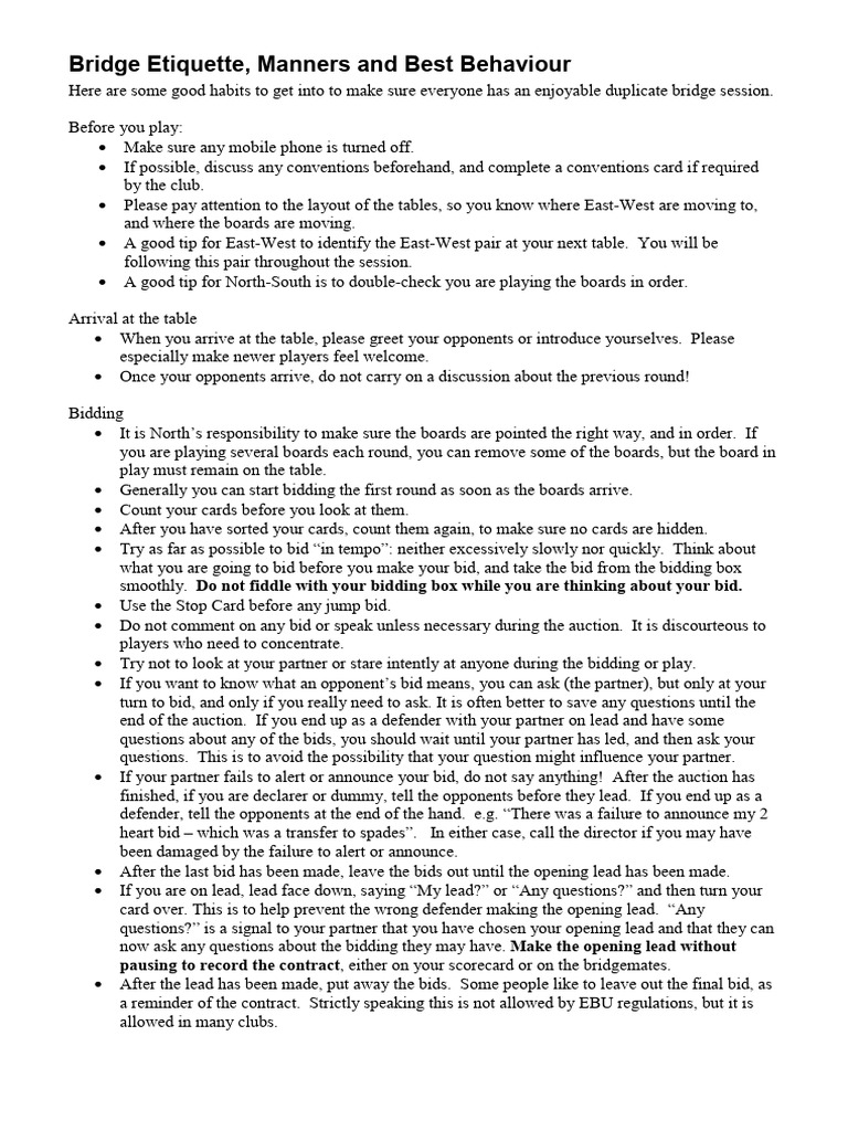 Bridge Etiquette, Manners and Best Behaviour