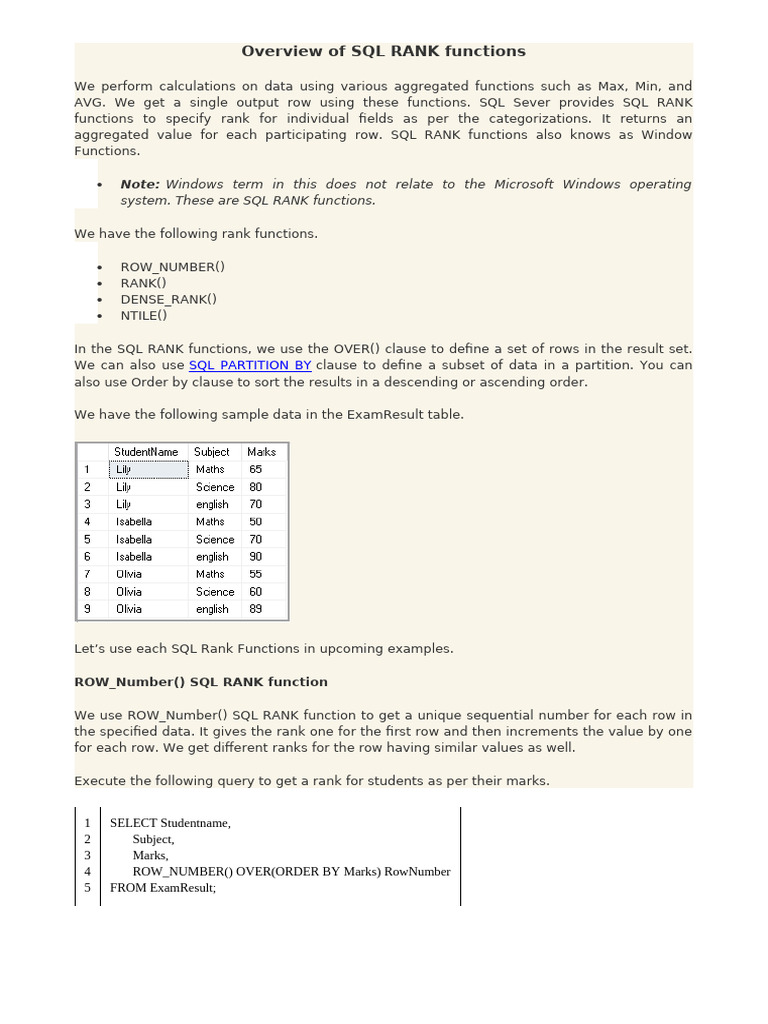 AVG. We get a single output row using these functions. SQL Sever provides SQL RANK