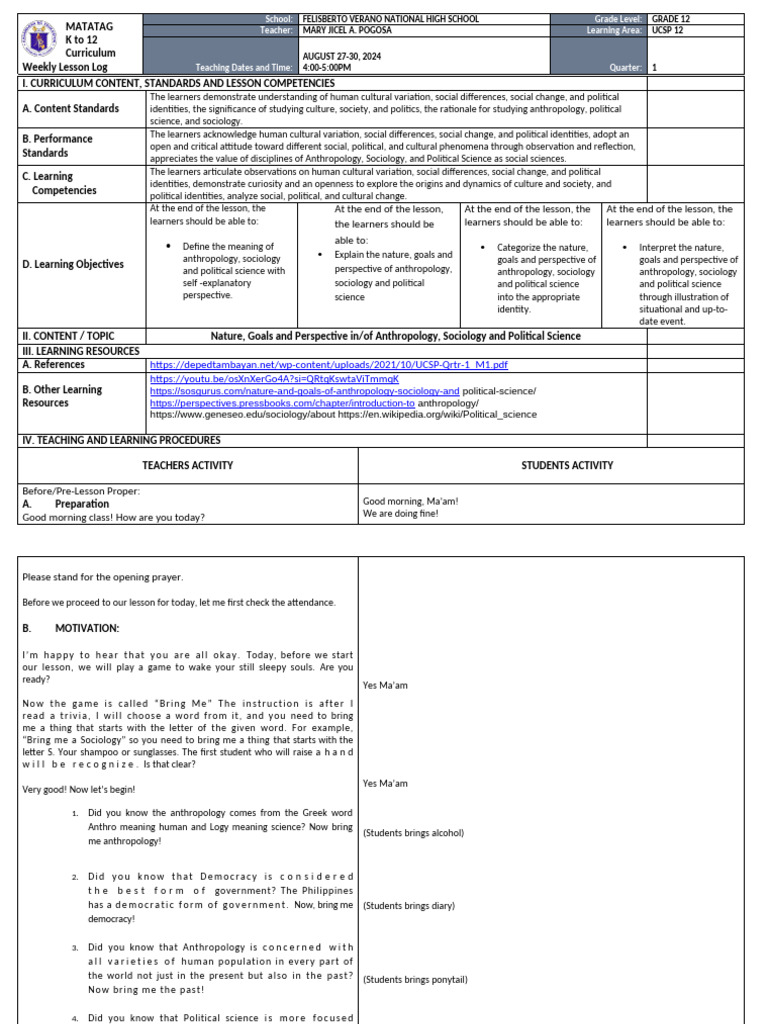 MATATAG Teacher: MARY JICEL A. POGOSA Learning Area: UCSP 12