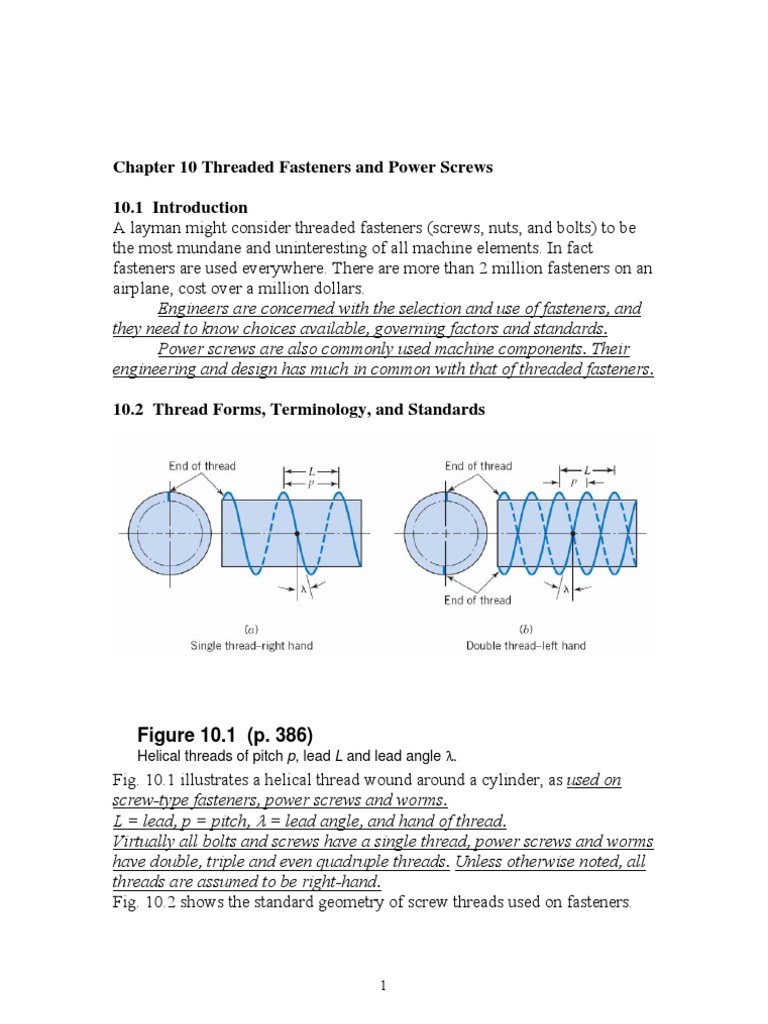 Fig. 10.1 illustrates a helical thread wound around a cylinder, as used on screw-type fasteners, power screws and worms. L = lead, p = pitch, = lead angle, and hand of thread. Virtually all bolts and screws have a single thread, power screws and worms have double, triple and even quadruple threads. Unless otherwise noted, all threads are assumed to be right-hand. Fig. 10.2 shows the standard geometry of screw threads used on fasteners.