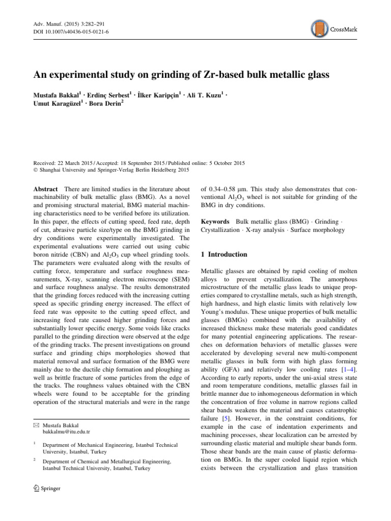 In this paper, the effects of cutting speed, feed rate, depth Keywords Bulk metallic glass (BMG) Grinding