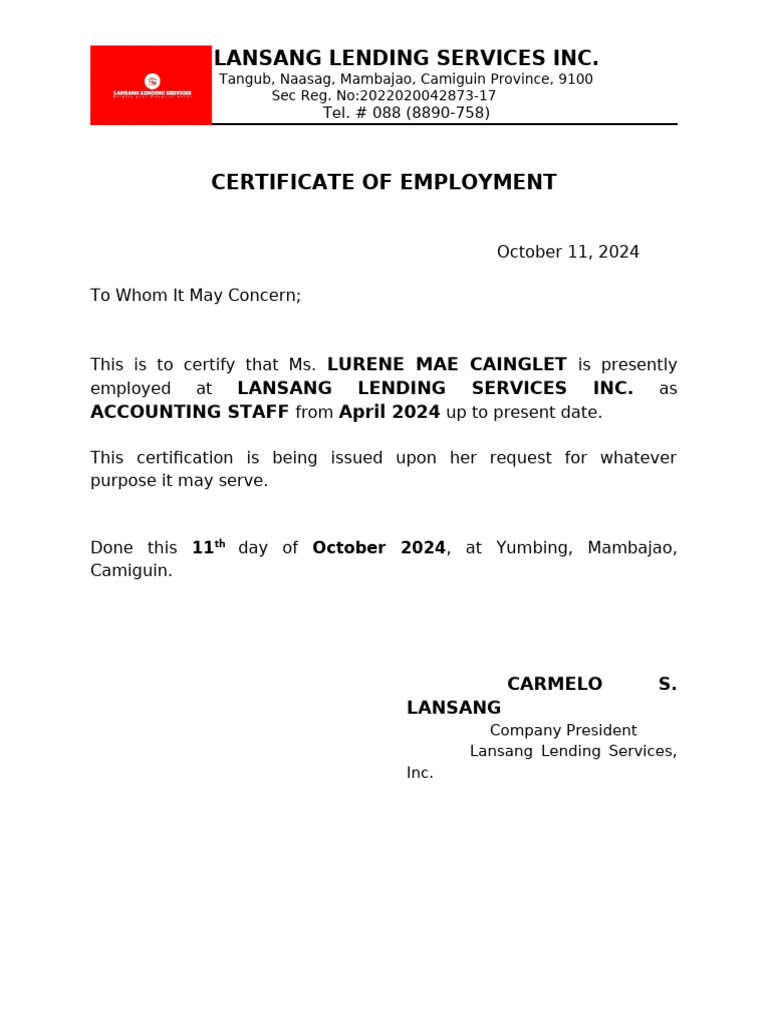 This is to certify that Ms. LURENE MAE CAINGLET is presently