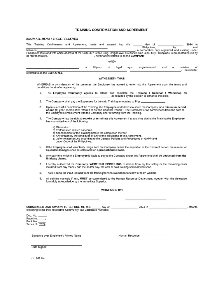 This Training Confirmation and Agreement, made and entered into this ______ day of _________________ 2024 in