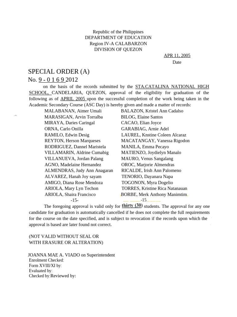 SCHOOL, CANDELARIA, QUEZON, approval of the eligibility for graduation of the