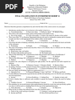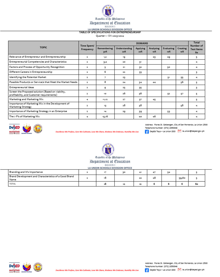 TABLE OF SPECIFICATIONS FOR ENTREPRENEURSHIP