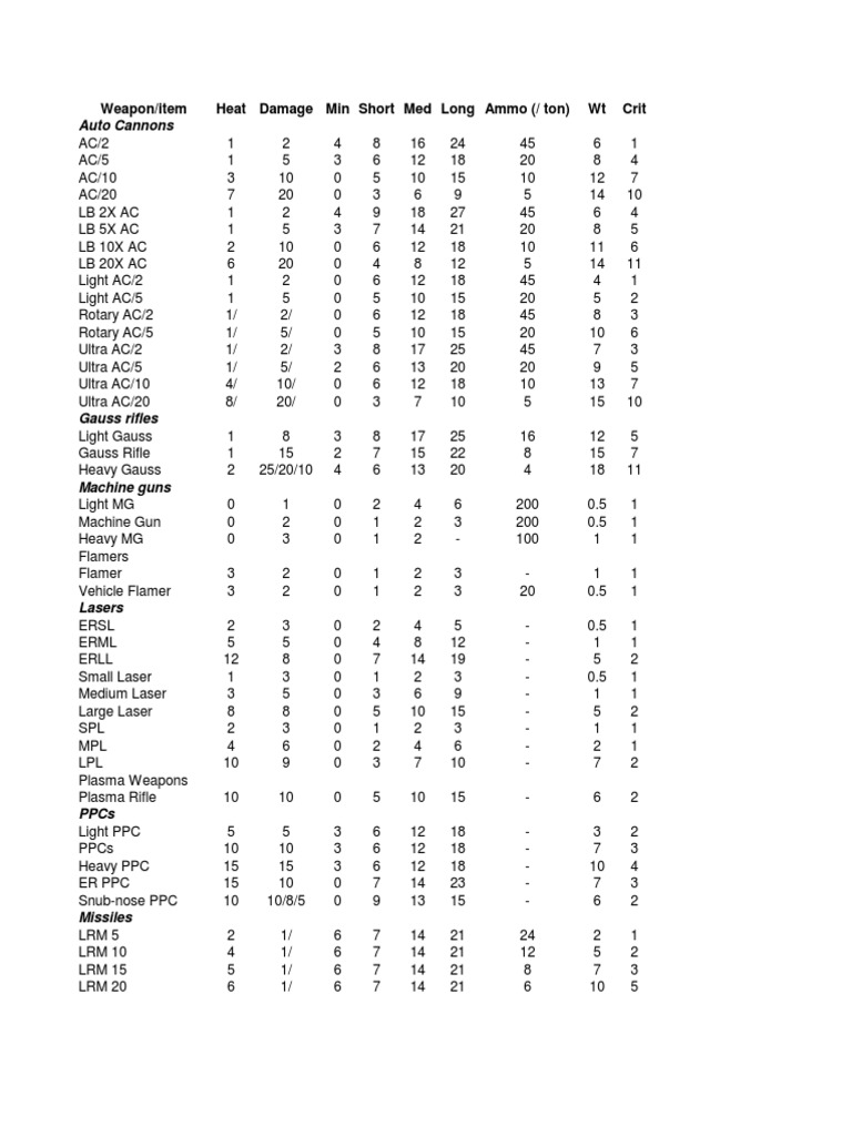 Heat Damage Min Short Med Long Ammo (/ ton)