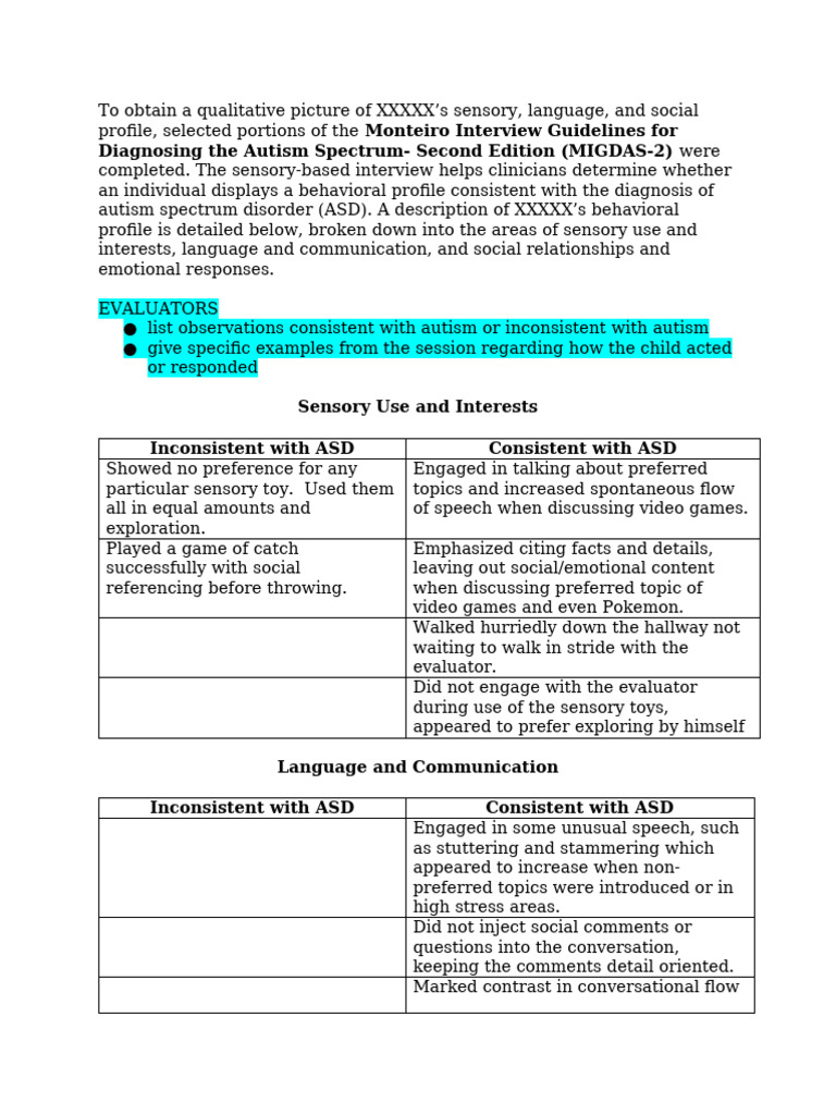 autism spectrum disorder (ASD). A description of XXXXX’s behavioral