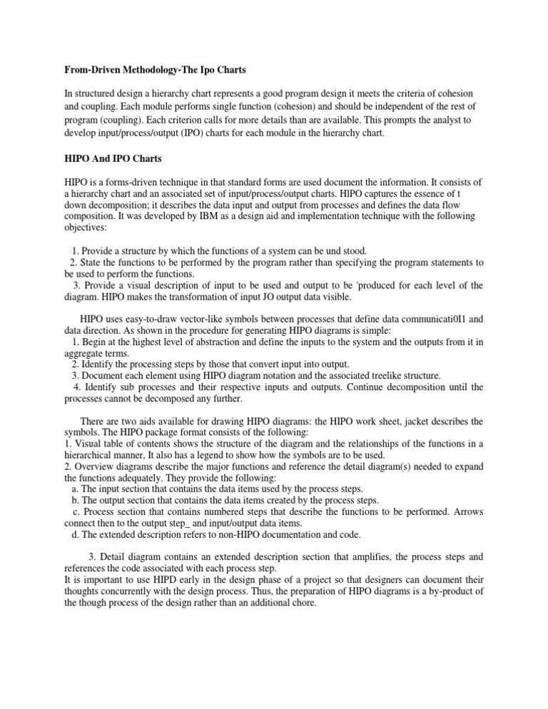 From-Driven Methodology-The Ipo Charts In structured design a hierarchy chart represents a good program design it meets the criteria