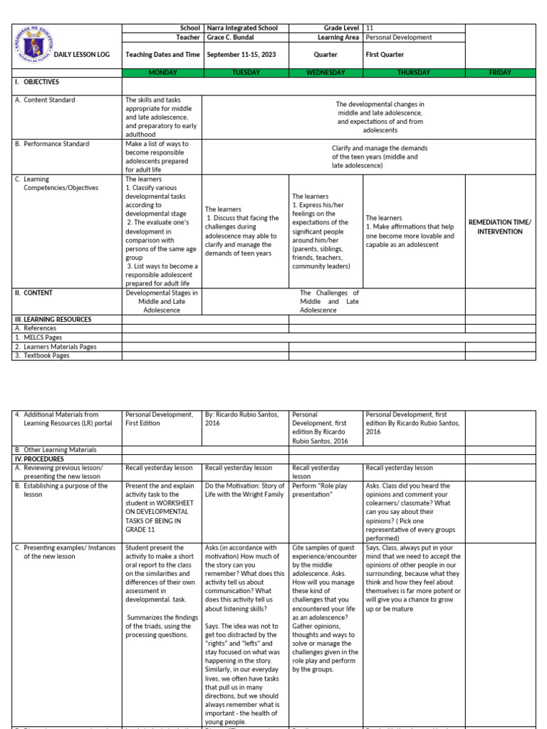 DAILY LESSON LOG Teaching Dates and Time September 11-15, 2023 Quarter First Quarter