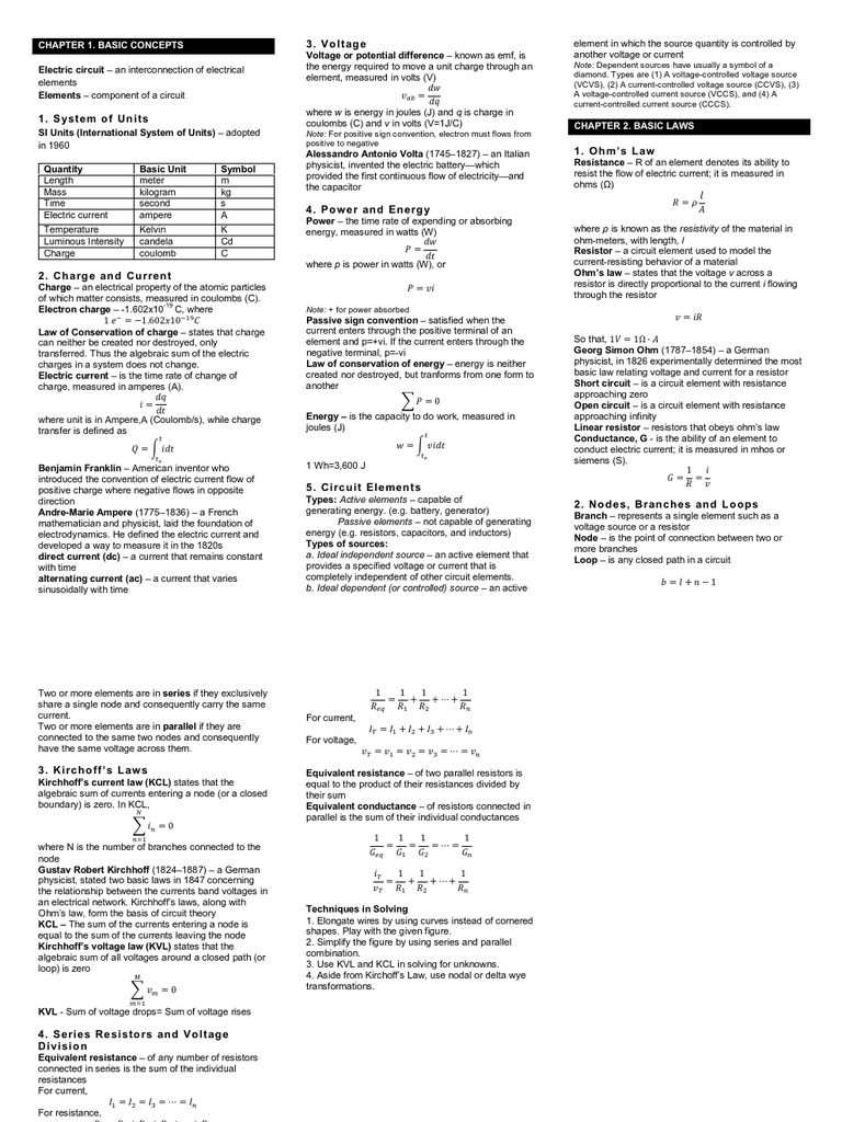 Passive sign convention satisfied when the current enters through the positive terminal of an element and p=+vi. If the current enters through the negative terminal, p=-vi Law of conservation of energy energy is neither created nor destroyed, but tranforms from one form to another Energy is the capacity to do work, measured in joules (J)