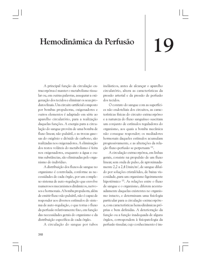 o do fluxo entre os diferentes rgos, privilegiando o crebro em detrimento do fluxo renal. A administrao de vasopressores, no raro, nessa fase da circulao extracorprea, contribui para o desarranjo hemodinmico, acentuando as irregularidades da distribuio especfica dos fluxos para as diversas regies do organismo. Quando o fluxo da perfuso se mantm constante durante o procedimento, a presso arterial mdia oscila, na dependncia das alteraes do tnus arteriolar, at prximo ao final da perfuso, quando o hematcrito est mais elevado, por eliminao de lquidos atravs a diurese ou pela redistribuio com o espao intersticial, aumentando a viscosidade do sangue [5]. Via de regra a presso arterial baixa no incio da perfuso e se eleva nos primeiros 5 a 10 minutos, atingindo um ponto de estabilidade. Volta a se elevar, de acordo com a liberao progressiva das catecolaminas e outros agentes vasopressores. O comportamento da presso arterial mdia, est ilustrado na figura 19.1. A influncia daquela dinmica arterial e arteriolar no metabolismo, se reflete na presena e na intensidade da acidose metablica [12]. Aps os primeiros trinta a quarenta minutos da perfuso, o volume total de perfusato, com frequncia diminui. Admite-se que o sequestro de sangue, em determinados compartimentos vasculares, principalmente as vsceras abdominais parcialmente responsvel pelo fenmeno. Breckenridge [13], dentre outros, demonstrou que o escape para o interstcio, pode remover at 20% do lquido