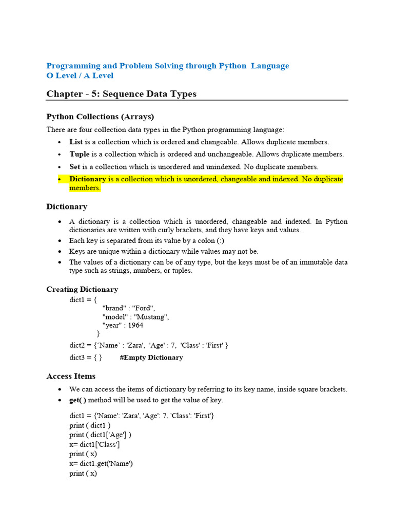 Dictionary is a collection which is unordered, changeable and indexed. No duplicate