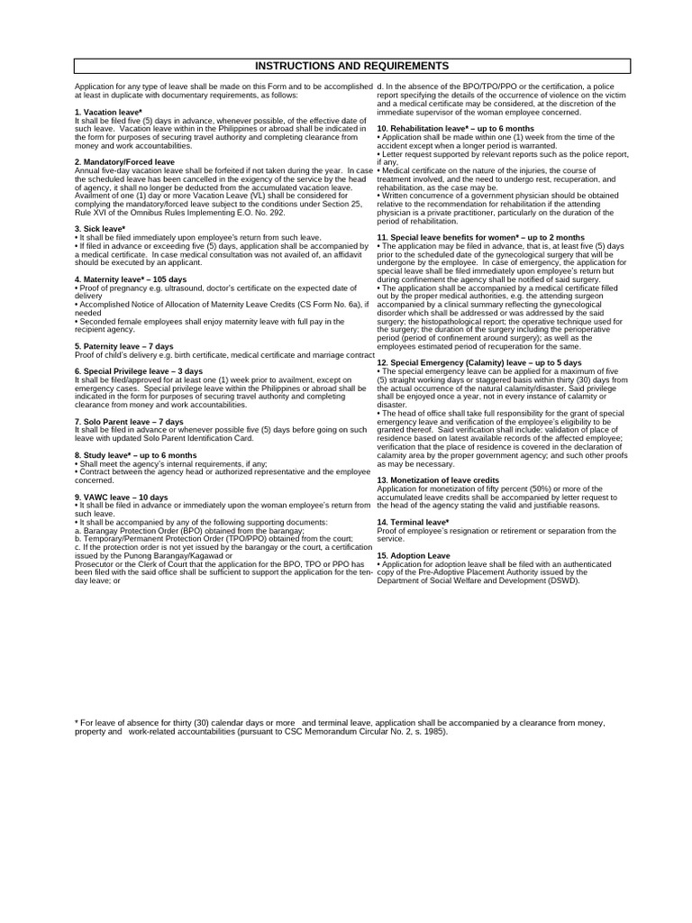 such leave. Vacation leave within in the Philippines or abroad shall be indicated in 10. Rehabilitation leave* – up to 6 months