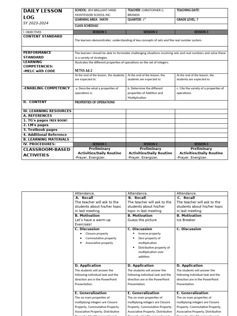 DAILY LESSON SCHOOL: JEM BRILLIANT MIND TEACHER: CHRISTOPHER G.
