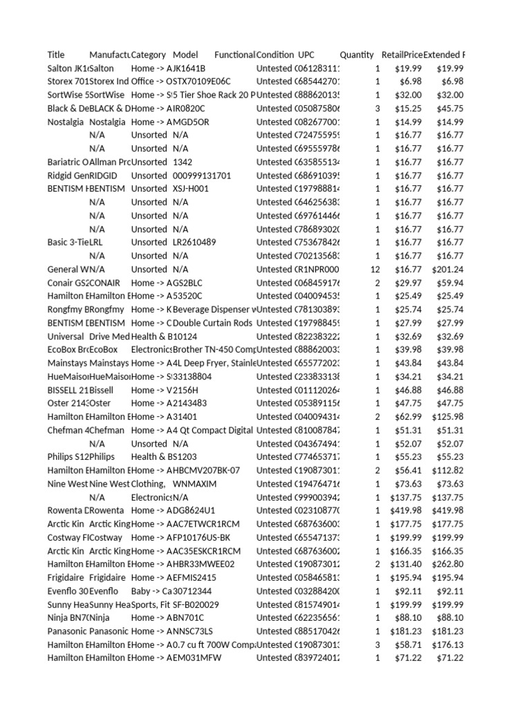 Title ManufactuCategory Model FunctionaliCondition UPC Quantity RetailPriceExtended RetailPrice