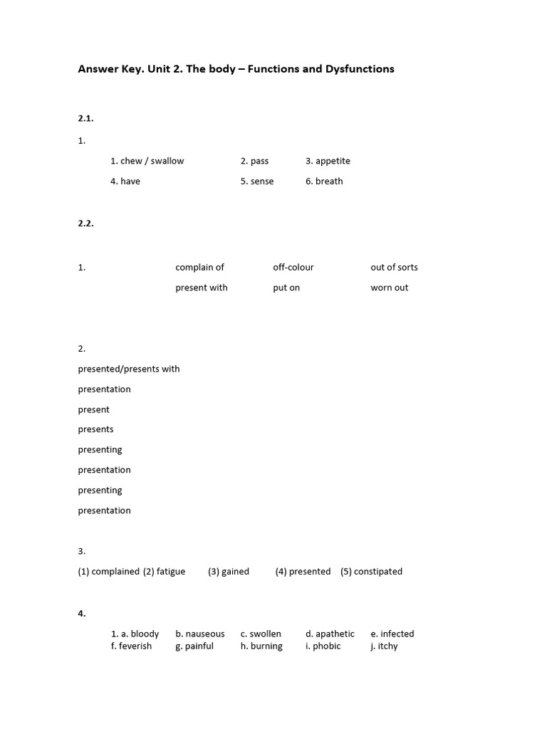 1. a. bloody b. nauseous c. swollen d. apathetic e. infected
