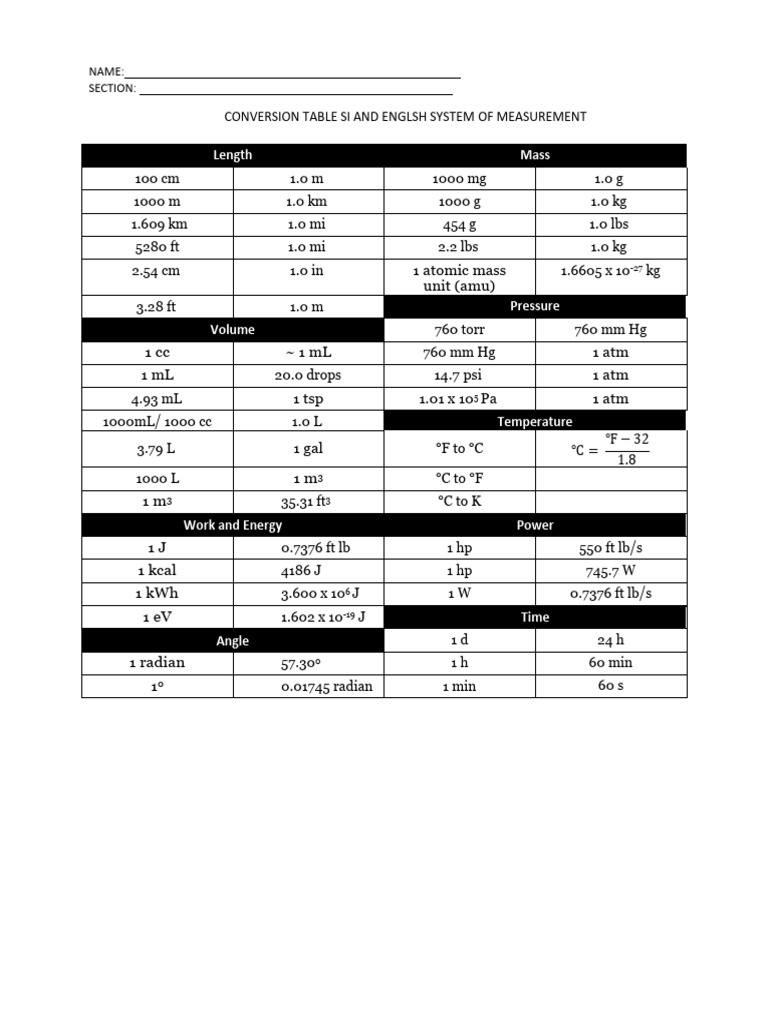 CONVERSION TABLE SI AND ENGLSH SYSTEM OF MEASUREMENT