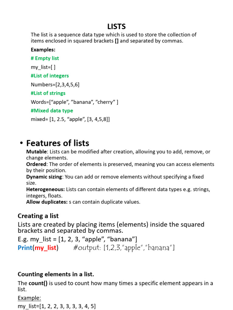• Lists can hold elements of different data types (integers, strings, floats