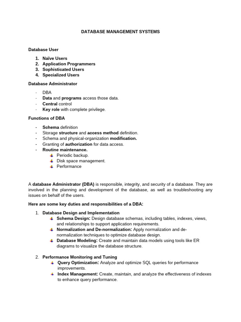 A database Administrator (DBA) is responsible, integrity, and security of a database. They are
