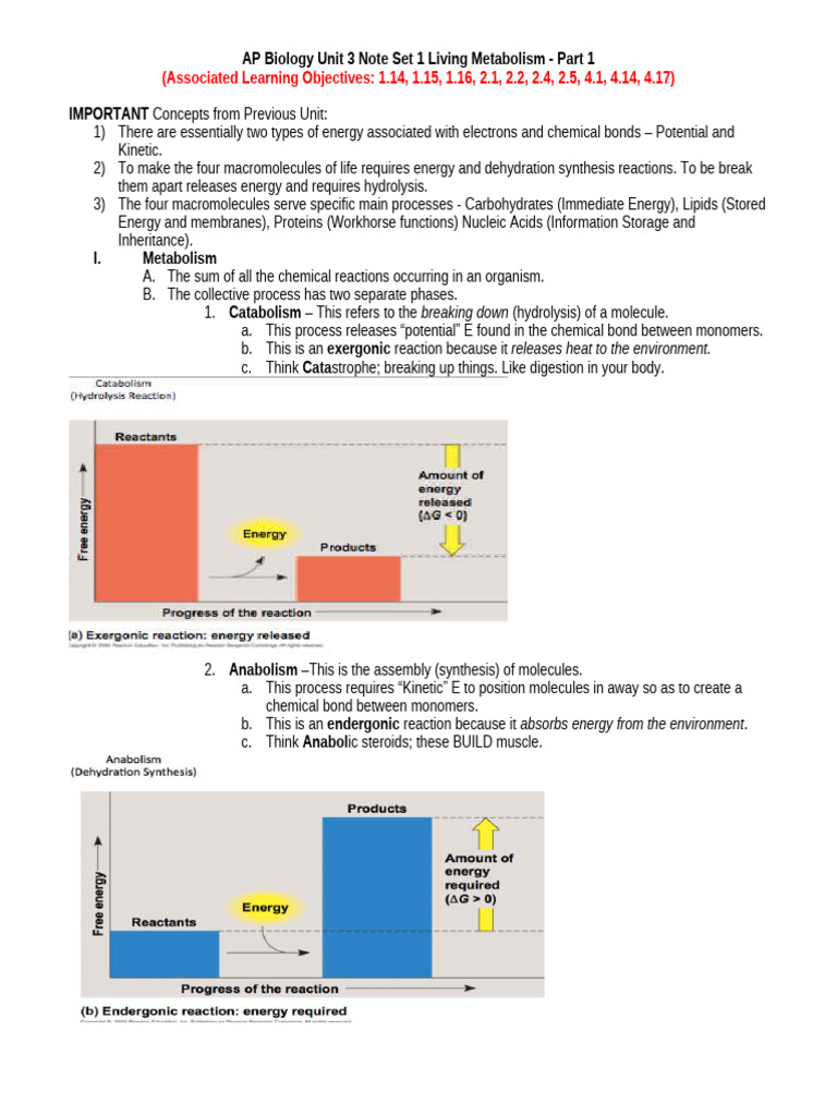 AP Biology Unit 3 Note Set 1 Living Metabolism - Part 1