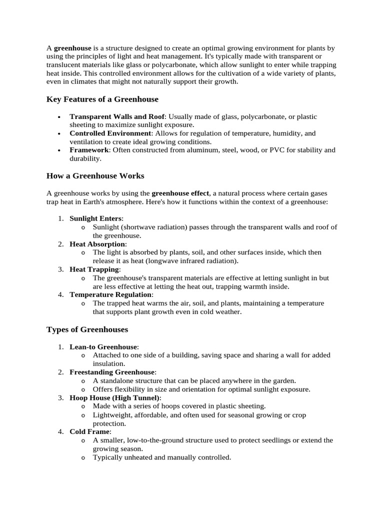 A greenhouse is a structure designed to create an optimal growing environment for plants by