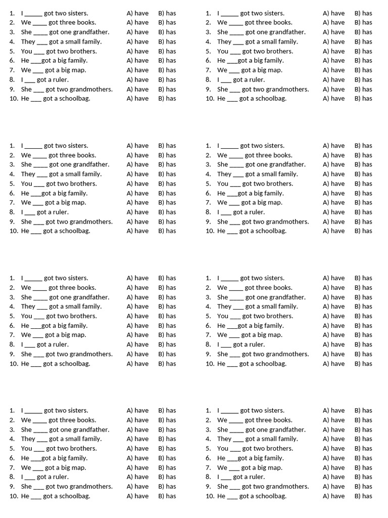3. She ____ got one grandfather. A) have B) has 3. She ____ got one grandfather. A) have B) has