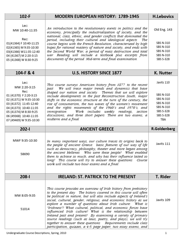 MWF 11:45‐12:40 history of Western Europe from the emergence of Christianity Javits 103