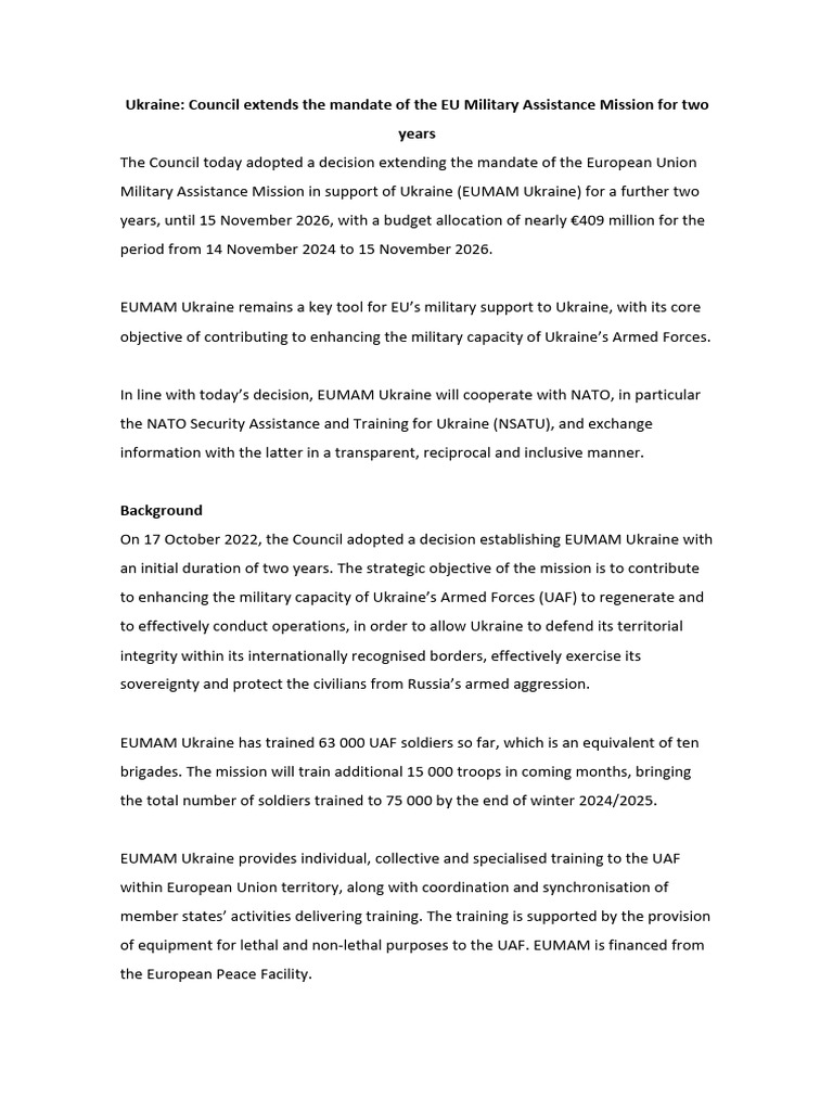 Military Assistance Mission in support of Ukraine (EUMAM Ukraine) for a further two