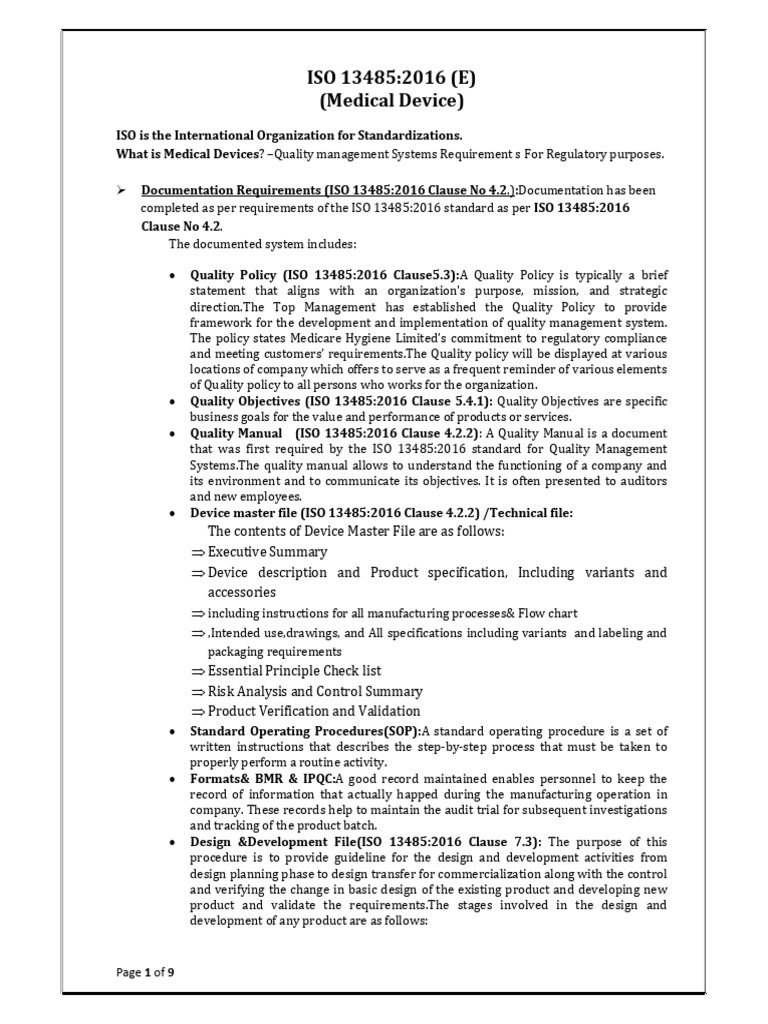 Quality Policy (ISO 13485:2016 Clause5.3):A Quality Policy is typically a brief