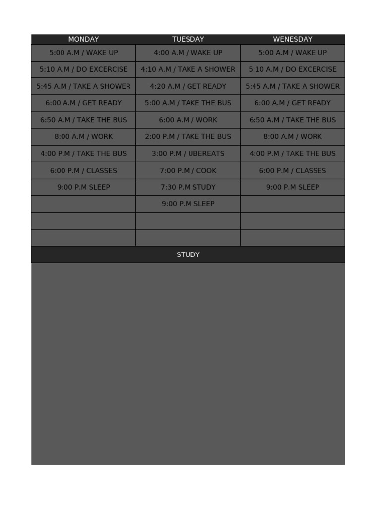 12:50 M.D / TAKE THE BUS 9:00 A.M / WORK 10:00 A.M / STUDY