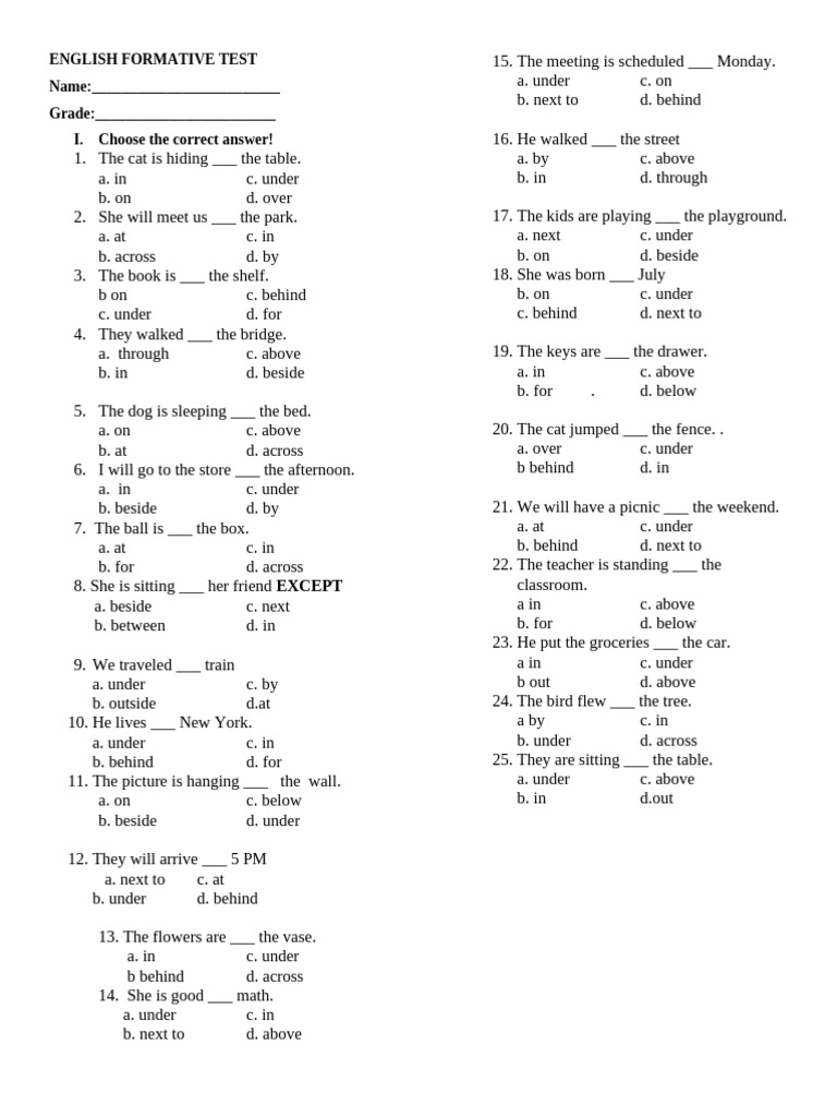 ENGLISH FORMATIVE TEST 15. The meeting is scheduled ___ Monday.
