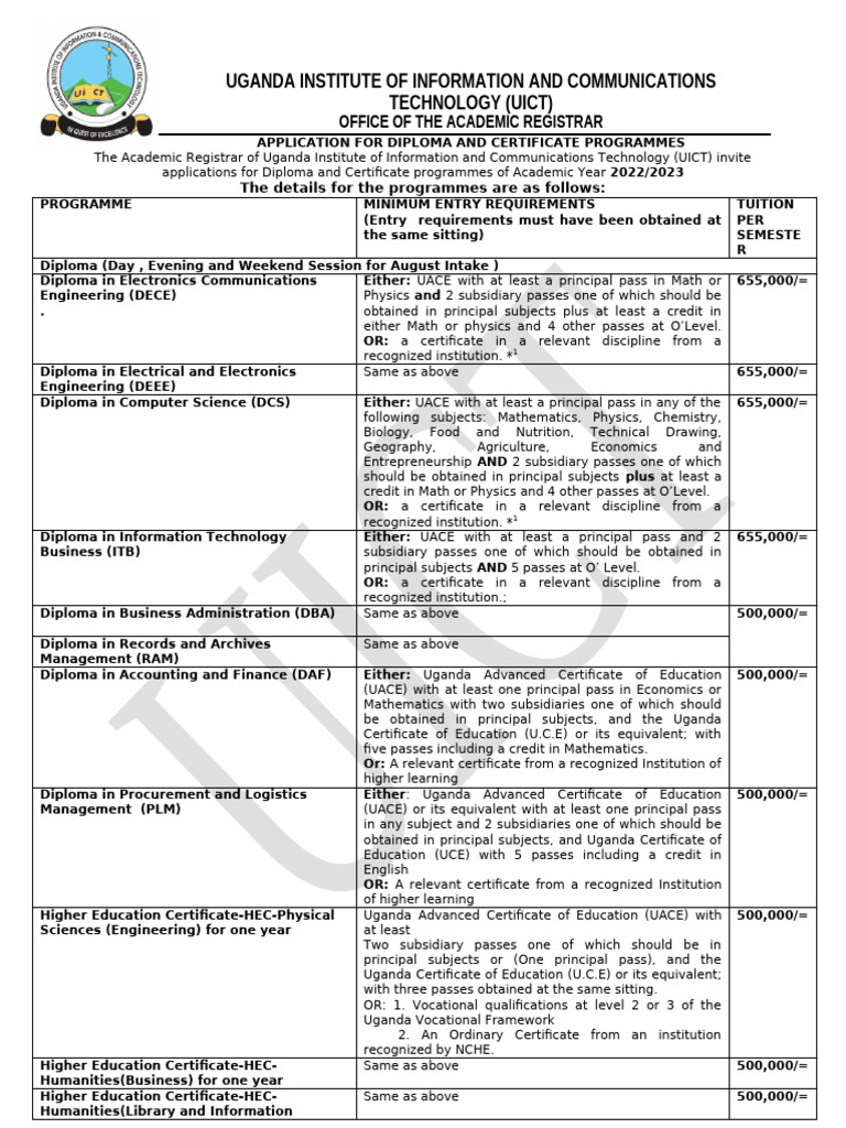 The Academic Registrar of Uganda Institute of Information and Communications Technology (UICT) invite