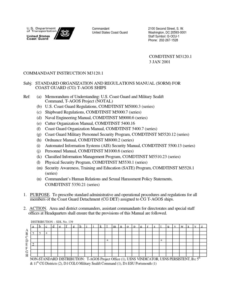 COMDTINST M3120.1 3 JAN 2001 COMMANDANT INSTRUCTION M3120.1 Subj: STANDARD ORGANIZATION AND REGULATIONS MANUAL (SORM) FOR COAST GUARD (CG) T-AGOS SHIPS Ref: (a) Memorandum of Understanding: U.S. Coast Guard and Military Sealift Command, T-AGOS Project (NOTAL) (b) U.S. Coast Guard Regulations, COMDTINST M5000.3 (series) (c) Shipboard Regulations, COMDTINST M5000.7 (series) (d) Naval Engineering Manual, COMDTINST M9000.6 (series) (e) Cutter Organization Manual, COMDTINST 5400.16 (f) Coast Guard Organization Manual, COMDTINST 5400.7 (series) (g) Coast Guard Military Personnel Security Program, COMDTINST M5520.12 (series) (h) Ordnance Manual, COMDTINST M8000.2 (series) (i) Automated Information Systems (AIS) Security Manual, COMDTINST 5500.13 (series) (j) Personnel Manual, COMDTINST M1000.6 (series) (k) Classified Information Management Program, COMDTINST M5510.23 (series) (l) Physical Security Program, COMDTINST M5530.1 (series) (m) Security Awareness, Training and Education (SATE) Program, COMDTINST M5528.1 (series) (n) Commandants Human Relations and Sexual Harassment Policy Statements, COMDTINST 5350.21 (series)