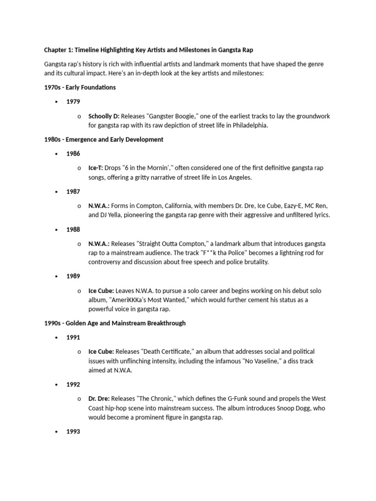 The timeline of gangsta rap highlights the genre's evolution from its early foundations to its mainstream