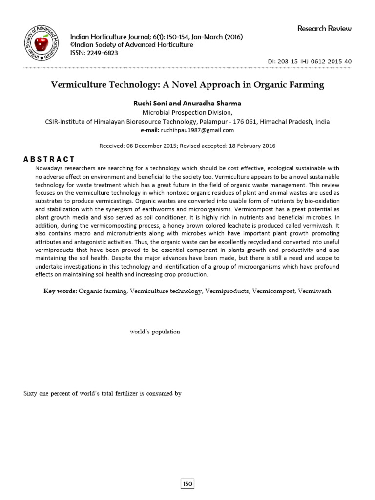 Key words: Organic farming, Vermiculture technology, Vermiproducts, Vermicompost, Vermiwash
