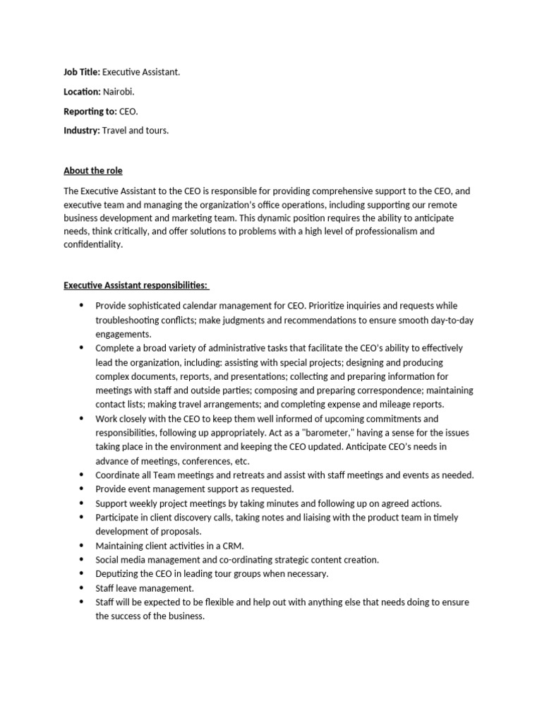 The Executive Assistant to the CEO is responsible for providing comprehensive support to the CEO, and