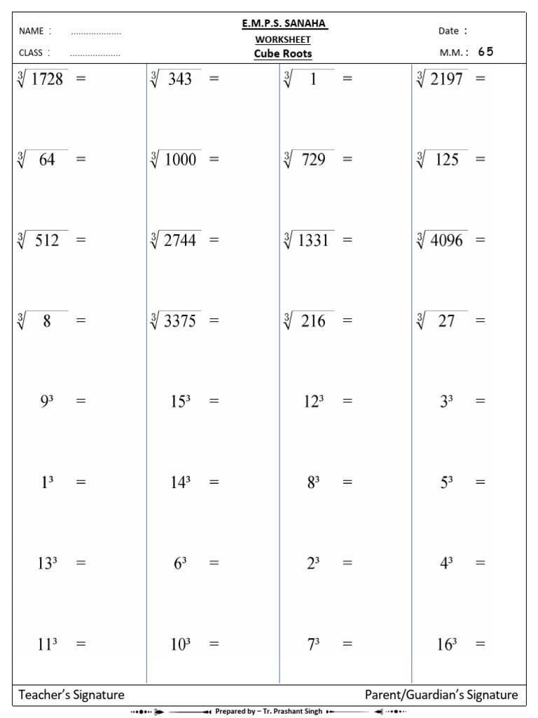 SANAHANAME : .................... Date : WORKSHEETCLASS : .................... Cube Roots M.M. : 6 5