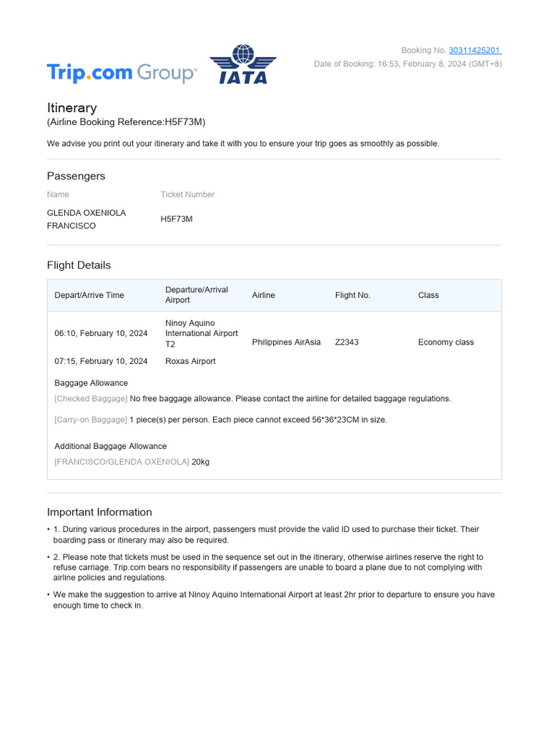 Date of Booking: 16:53, February 8, 2024 (GMT+8)