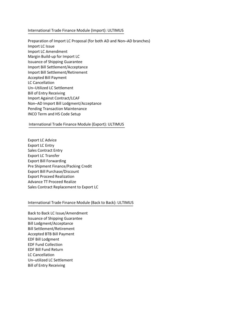 International Trade Finance Module (Back to Back): ULTIMUS Back to Back LC Issue/Amendment Issuance of Shipping Guarantee Bill Lodgment/Acceptance Bill Settlement/Retirement Accepted BTB Bill Payment EDF Bill Lodgment EDF Fund Collection EDF Bill Fund Return LC Cancellation Un utilized LC Settlement Bill of Entry Receiving