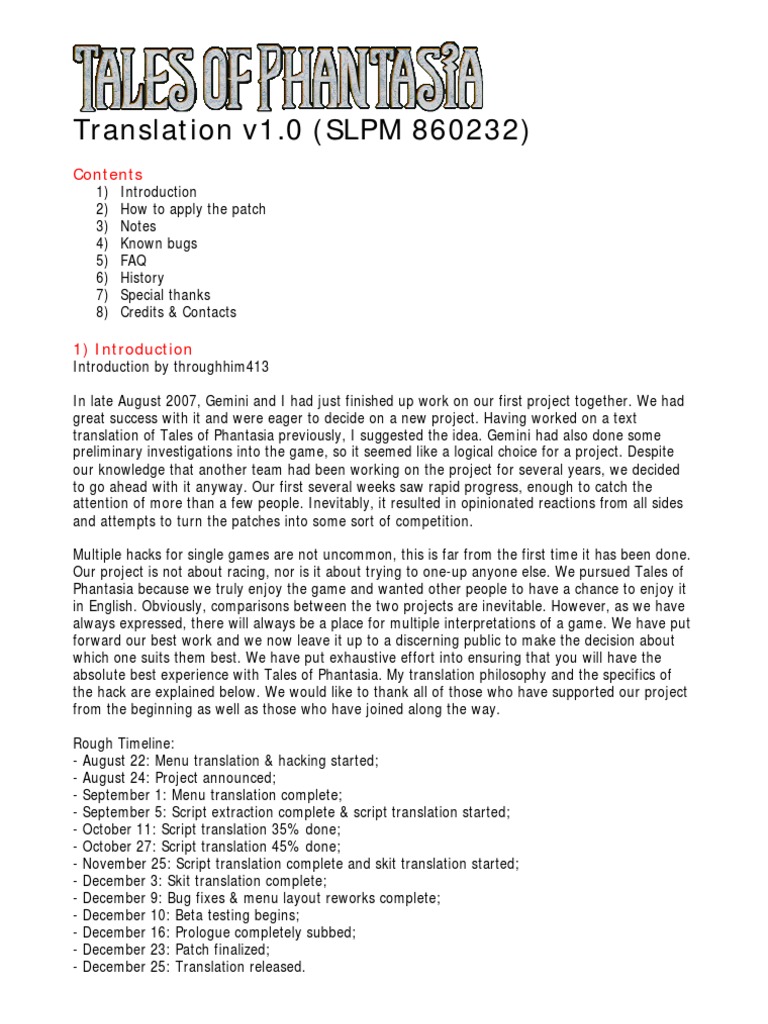 Introduction by throughhim413 In late August 2007, Gemini and I had just finished up work on our first project together. We had great success with it and were eager to decide on a new project. Having worked on a text translation of Tales of Phantasia previously, I suggested the idea. Gemini had also done some preliminary investigations into the game, so it seemed like a logical choice for a project. Despite our knowledge that another team had been working on the project for several years, we decided to go ahead with it anyway. Our first several weeks saw rapid progress, enough to catch the attention of more than a few people. Inevitably, it resulted in opinionated reactions from all sides and attempts to turn the patches into some sort of competition. Multiple hacks for single games are not uncommon, this is far from the first time it has been done. Our project is not about racing, nor is it about trying to one-up anyone else. We pursued Tales of Phantasia because we truly enjoy the game and wanted other people to have a chance to enjoy it in English. Obviously, comparisons between the two projects are inevitable. However, as we have always expressed, there will always be a place for multiple interpretations of a game. We have put forward our best work and we now leave it up to a discerning public to make the decision about which one suits them best. We have put exhaustive effort into ensuring that you will have the absolute best experience with Tales of Phantasia. My translation philosophy and the specifics of the hack are explained below. We would like to thank all of those who have supported our project from the beginning as well as those who have joined along the way. Rough Timeline: - August 22: Menu translation & hacking started; - August 24: Project announced; - September 1: Menu translation complete; - September 5: Script extraction complete & script translation started; - October 11: Script translation 35% done; - October 27: Script translation 45% done; - November 25: Script translation complete and skit translation started; - December 3: Skit translation complete; - December 9: Bug fixes & menu layout reworks complete; - December 10: Beta testing begins; - December 16: Prologue completely subbed; - December 23: Patch finalized; - December 25: Translation released.